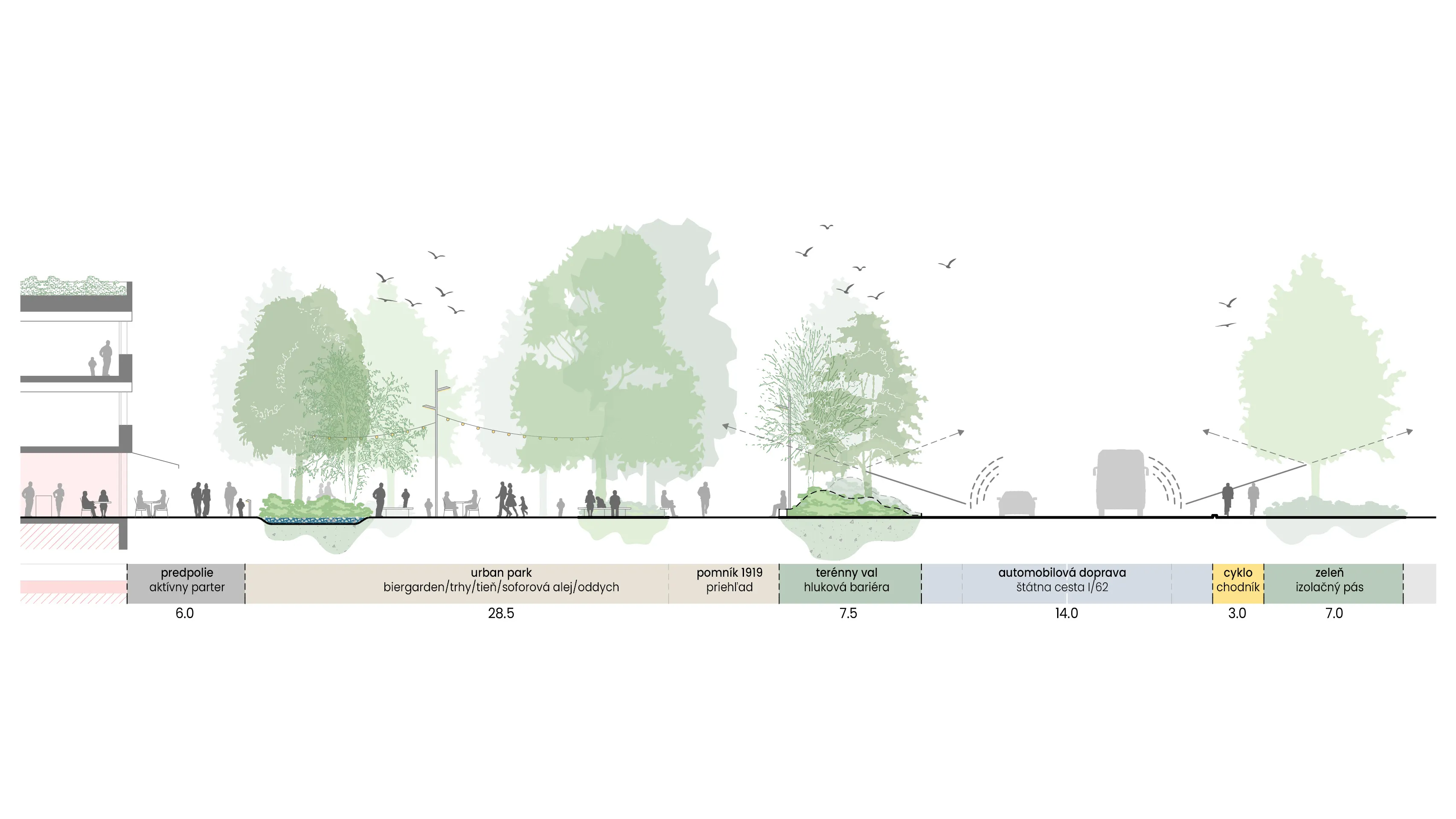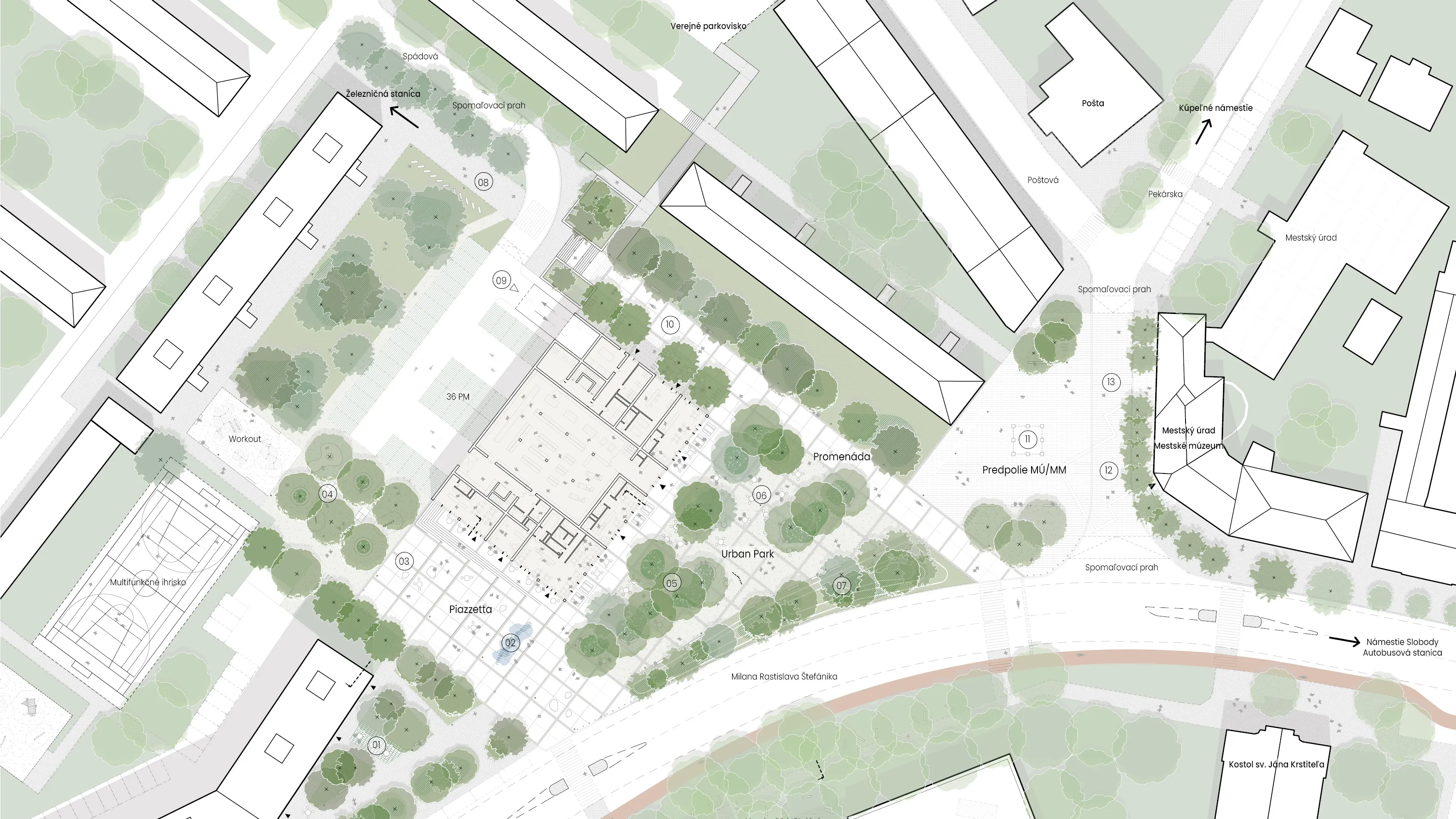 Existujúce stromoradie je doplnené o novú výsadbu, vodopriepustné mlatové plochy a kvetinové záhony. Vzniká tak pobytovo-rekreačný mestský parčík – „pľúca“ územia, oddelený od rušnej komunikácie terénnym valom a zeleňou. Navrhujeme ho ako neformálny, multifunkčný priestor s posedením a s možnosťou vylievania aktivít parteru smerom do parčíku.
