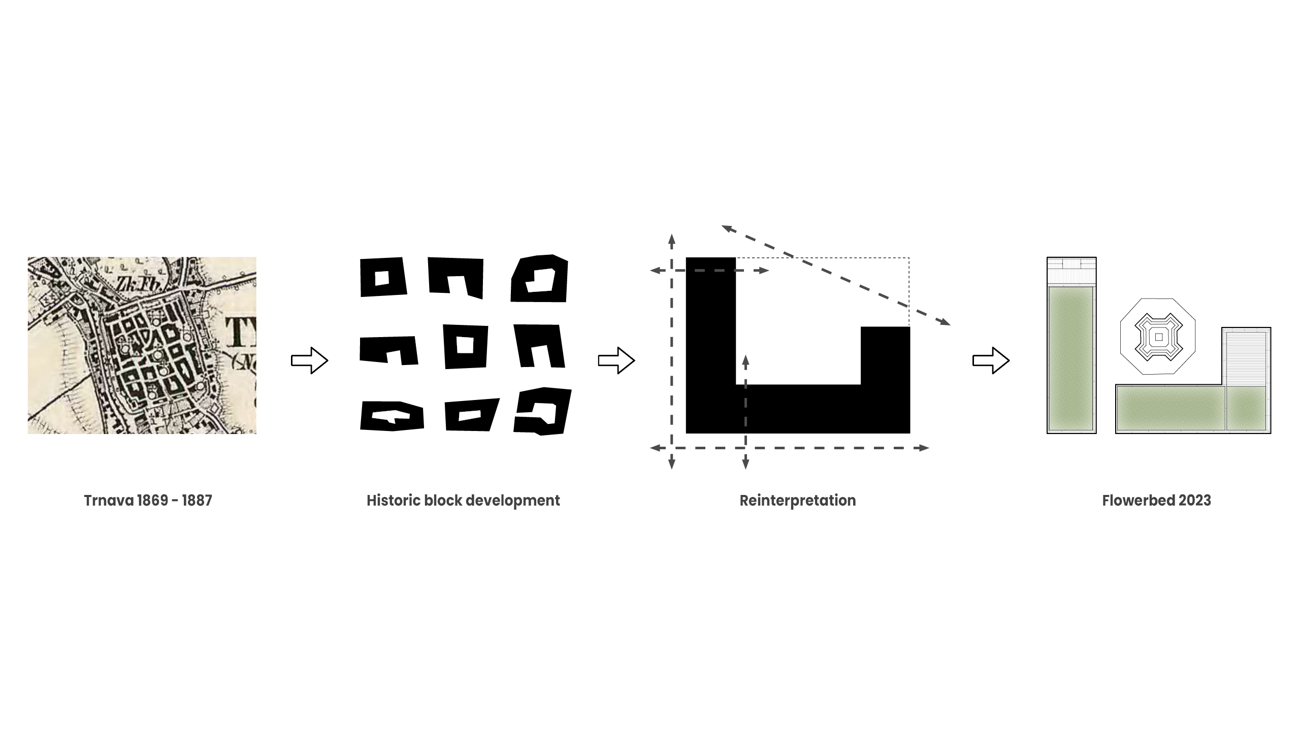 Návrh kompozície kvetinového záhonu so sedením vychádza z analýzy historického jadra mesta Trnava.