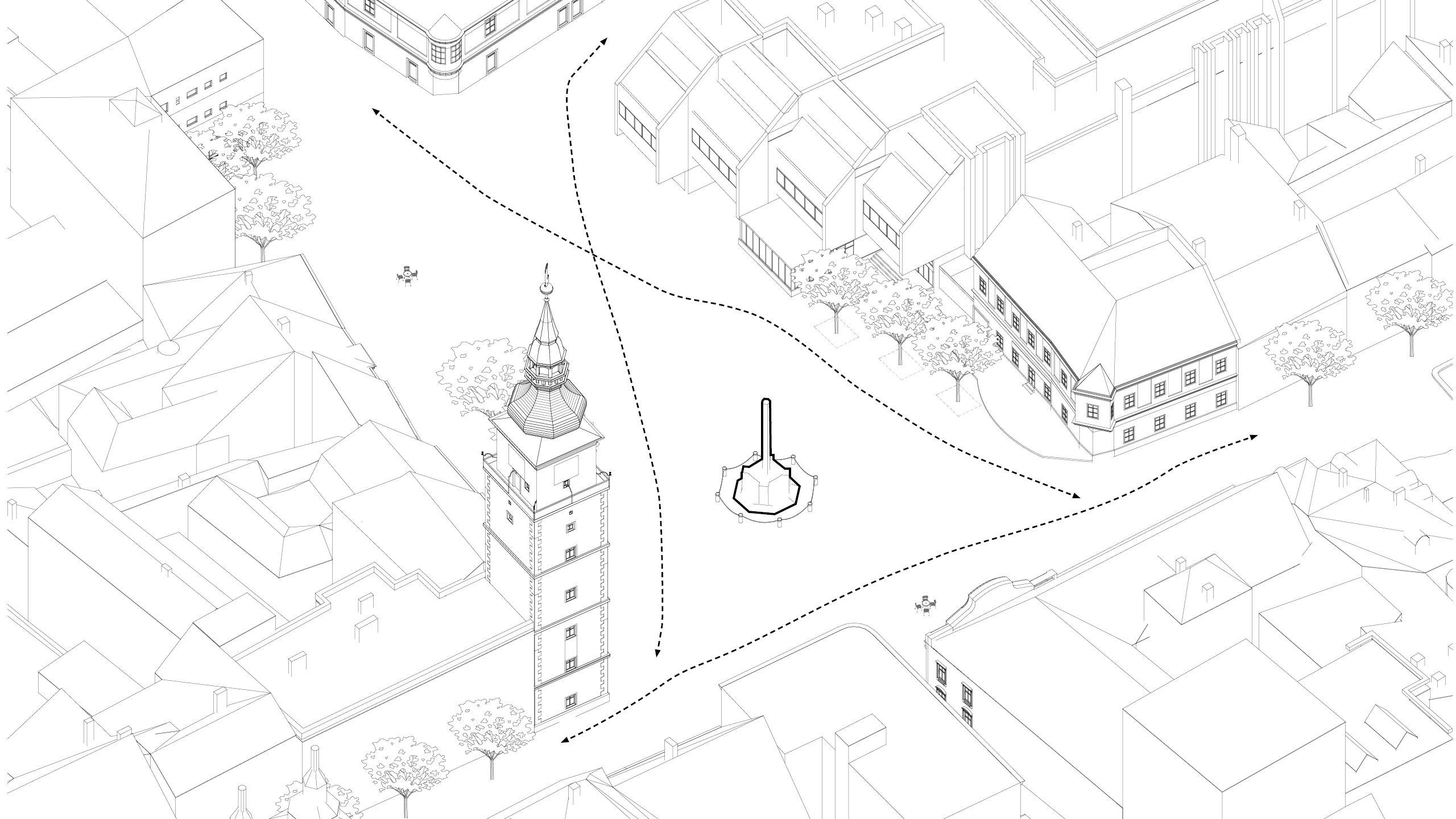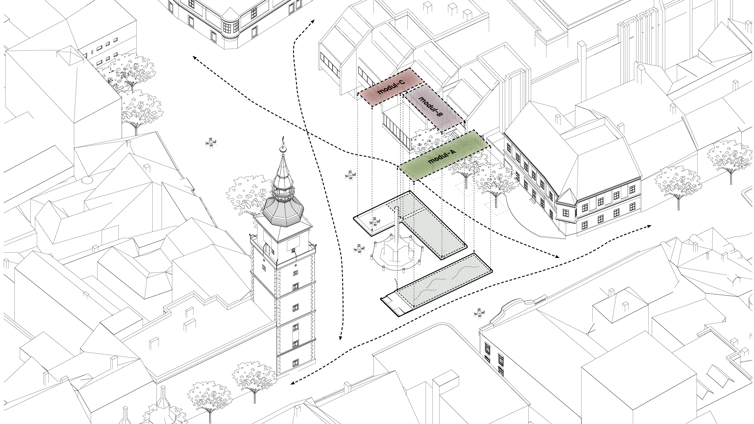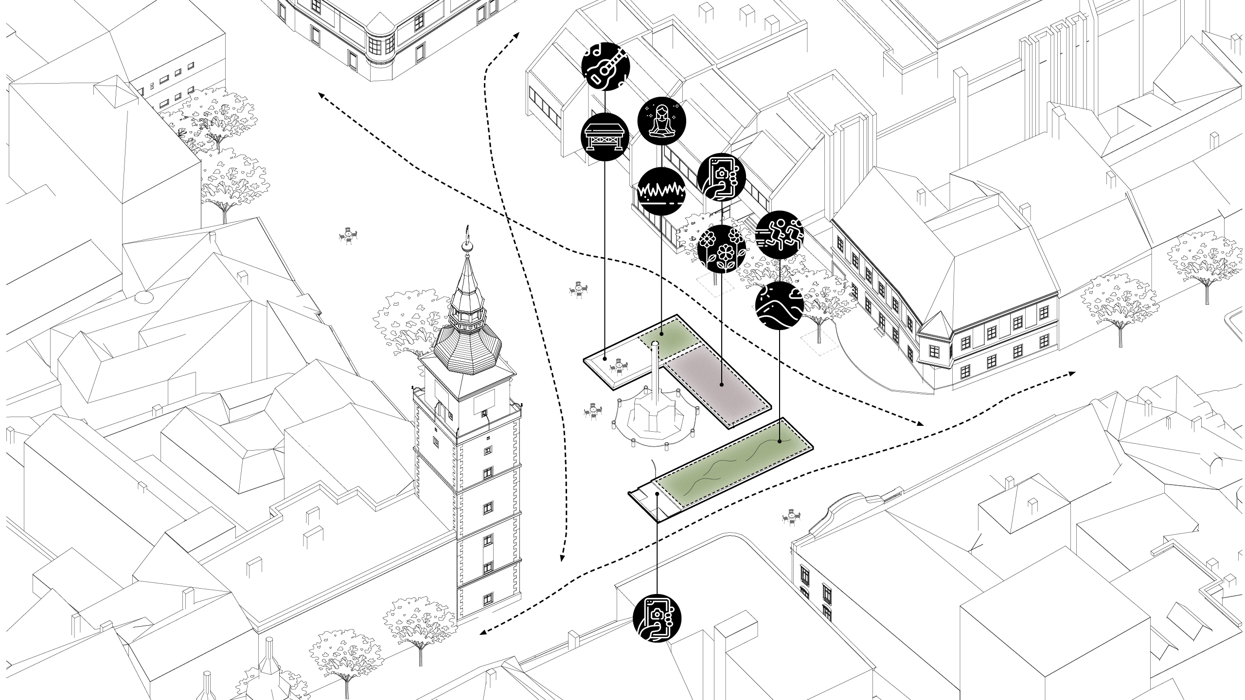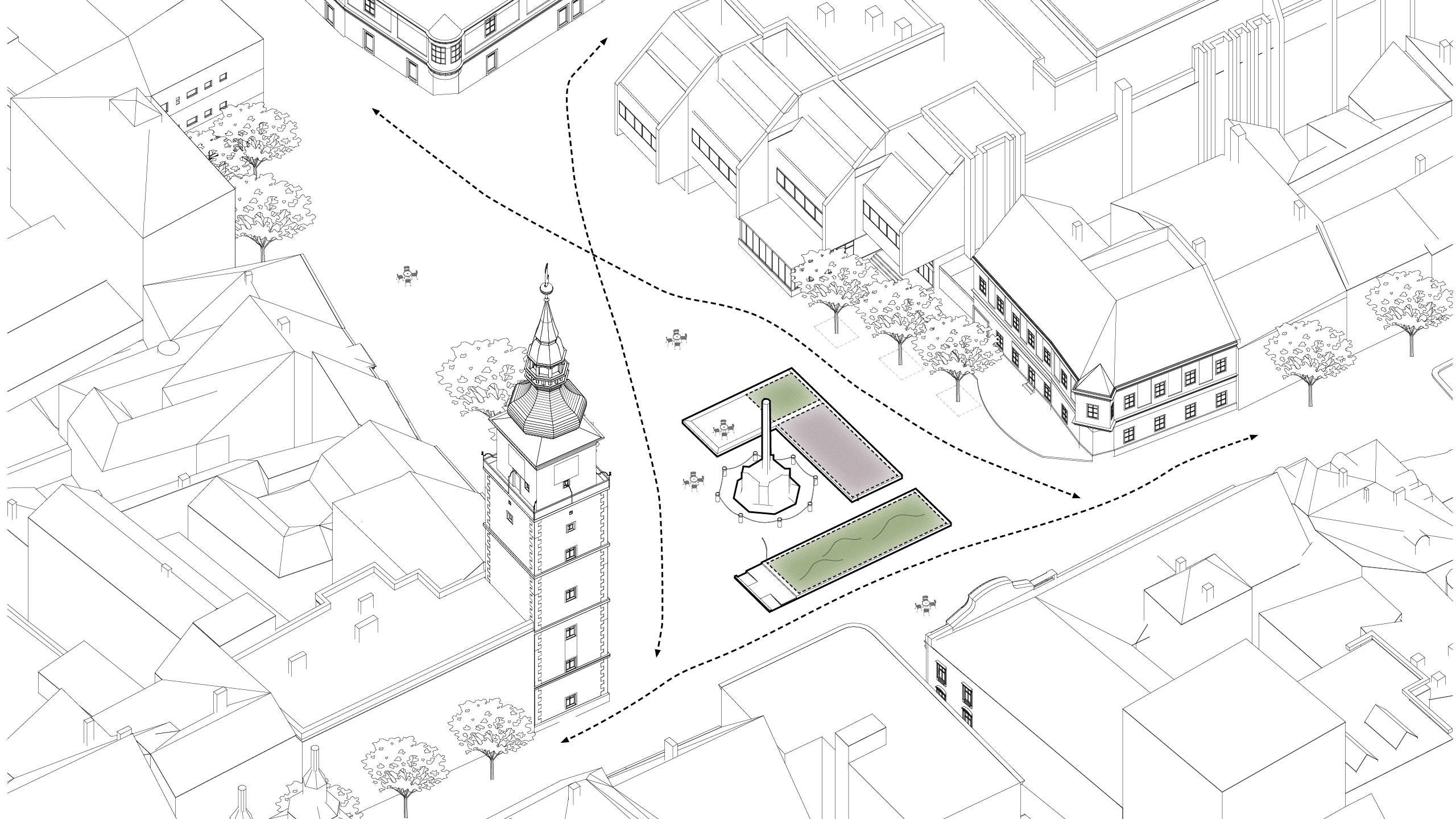 Hlavnou myšlienkou konceptu sa stáva pôdorysná analógia s historickou blokovou zástavbou. Umiestnenie konštrukcie záhonu plne rešpektuje pešie a zásobovacie trasy. Ponecháva odkryté priehľady na sochu Svätej Trojice, nekonkuruje jej.